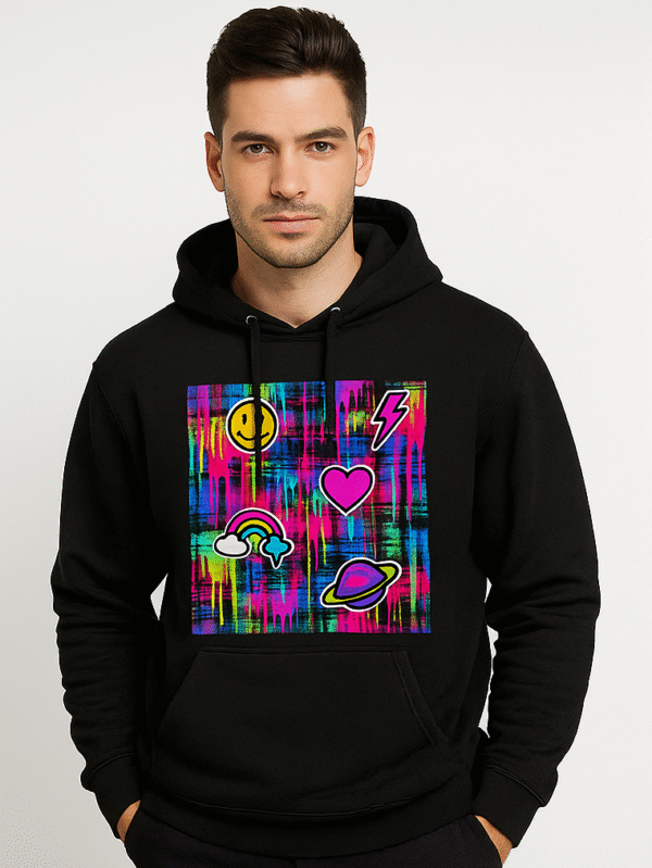 A vibrant black men's hoodie with a neon plaid pattern and colorful emoji accents, perfect for a fun and trendy streetwear look.