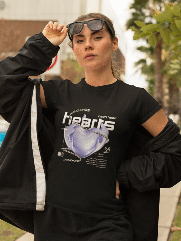 Shine through the static. The “Neon Heart” tee wraps vulnerability in chrome—where love meets light in a digital dream.