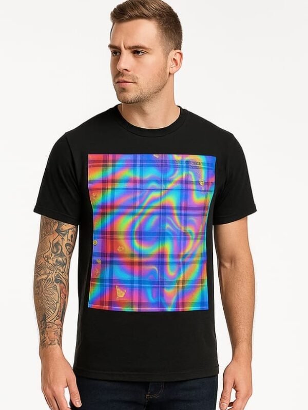 A bold black men's t-shirt with a vibrant rainbow swirl pattern, ideal for a striking and trendy casual look.