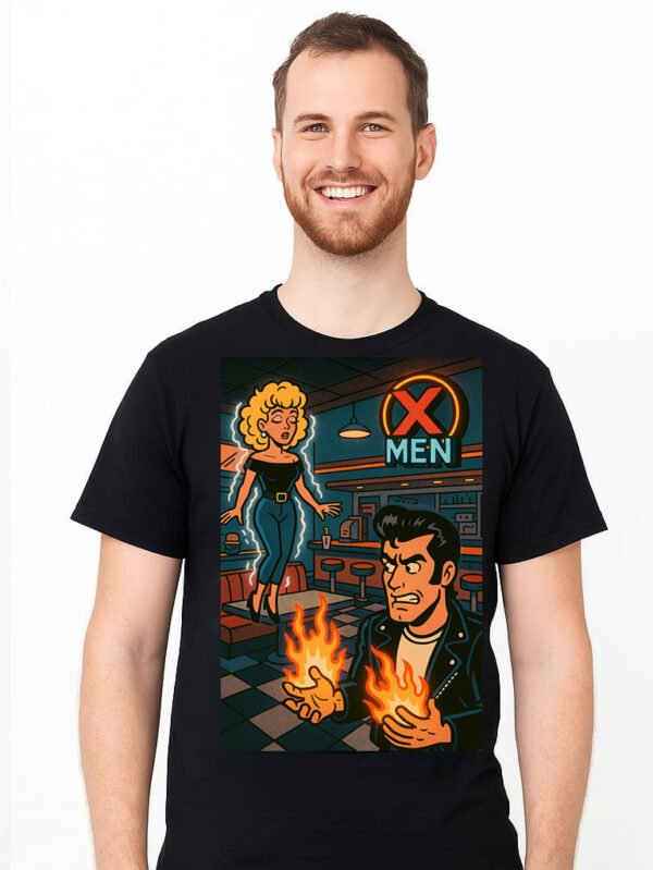 A retro mashup tee where X-Men become 50s greasers. Pompadours, powers, and mutant swagger collide in this comic-style parody shirt.