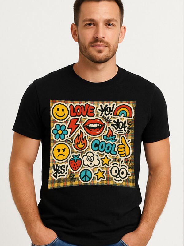 Make a statement with this black tee featuring a vibrant grid of emojis and symbols. Perfect for lovers of bold streetwear and modern art.
