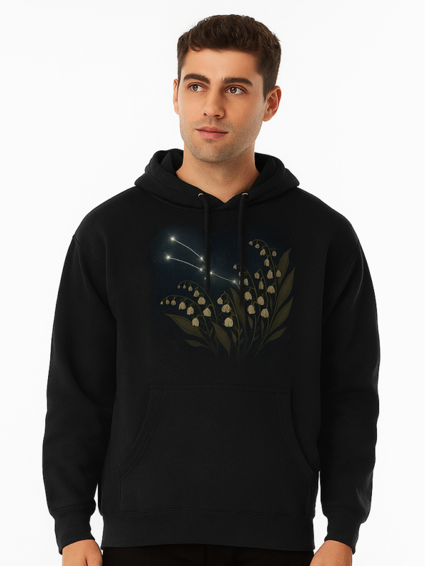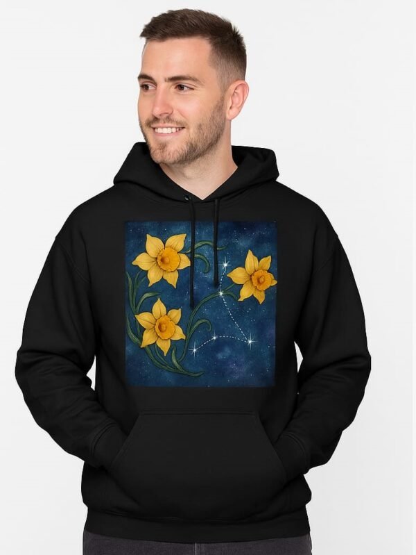 A black hoodie featuring vibrant yellow daffodils connected by constellation lines against a starry night sky—where flowers bloom among the stars.