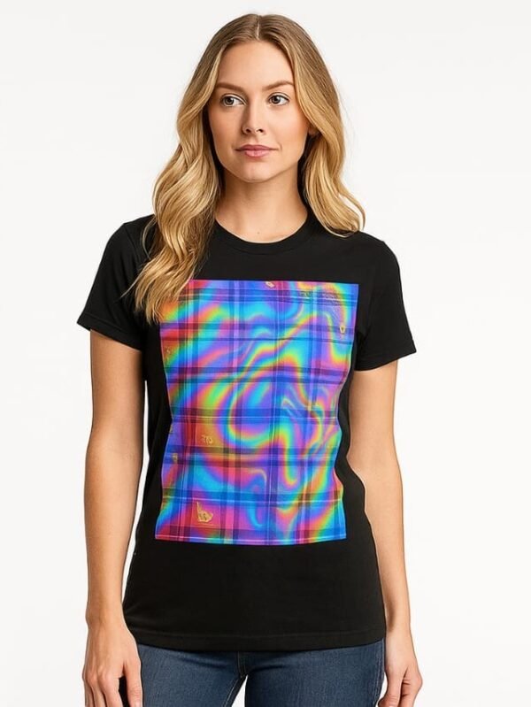 € 65.00A vibrant black women's t-shirt with a colorful plaid and checkered pattern, perfect for a bold and casual style. A vibrant plaid pattern with vivid colors.