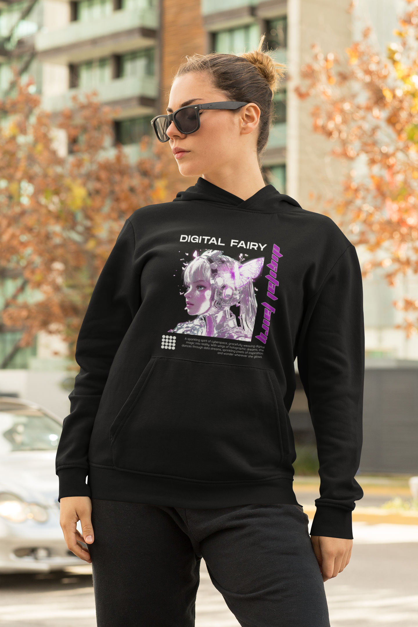 Step into a world of digital enchantment with the Digital Fairy Hoodie, a stunning tribute to transformation and futuristic fantasy. Made from a soft cotton-poly blend with a relaxed unisex pullover fit, this black hoodie features a stylized robotic fairy in metallic and purple tones, bold “DIGITAL FAIRY” typography, and vertical “digital reborn” text, paired with a mysterious poetic block. Perfect for Y2K aesthetic lovers, cybercore fashion fans, and digital dreamers, this hoodie is your wearable reboot for bold, pixelated style.