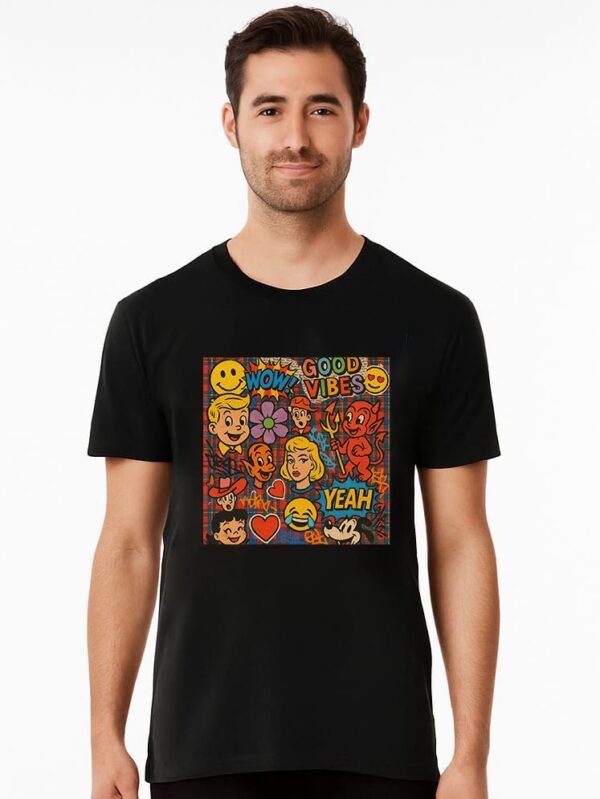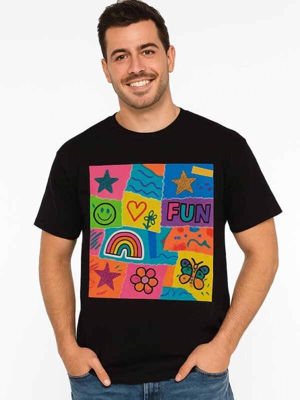 This black tee is a burst of expressive energy—featuring a vibrant collage of smiley faces, flames, rainbows, and fun phrases like “LOVE,” “COOL,” and “YES!"