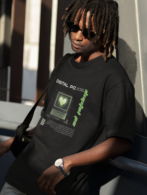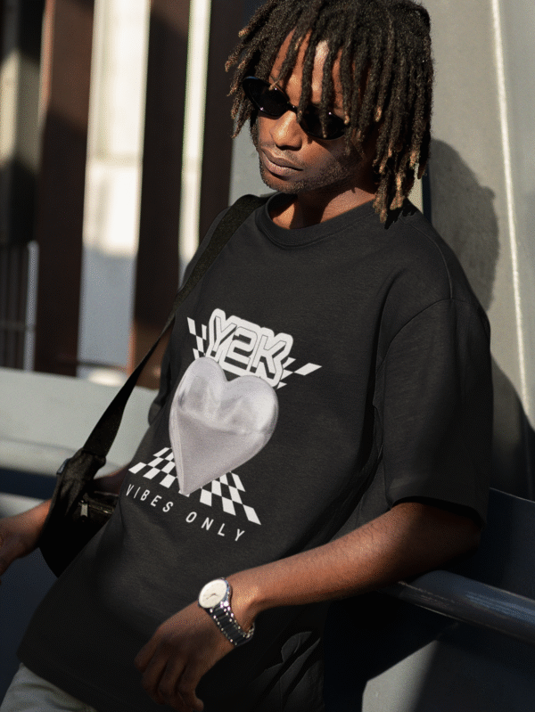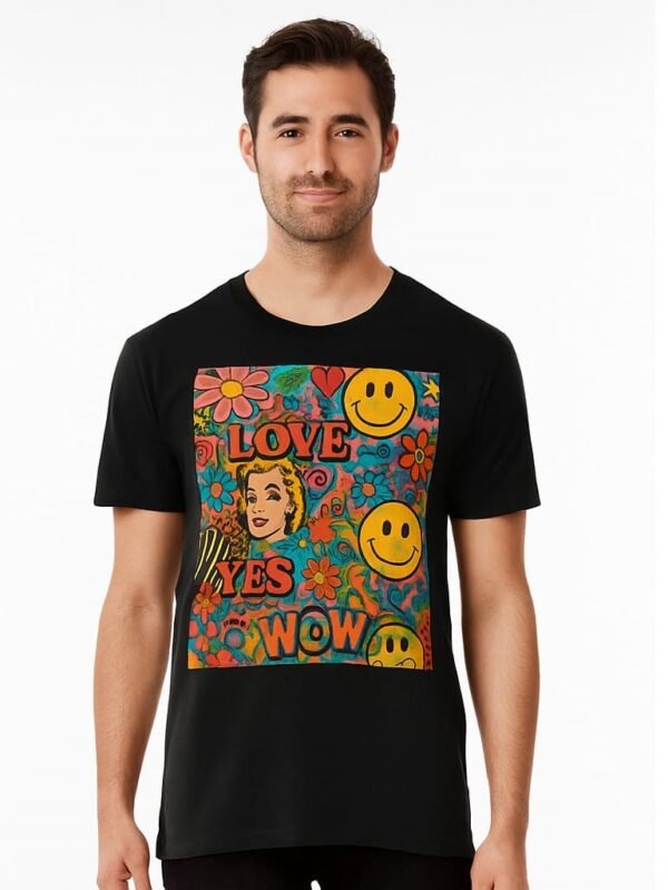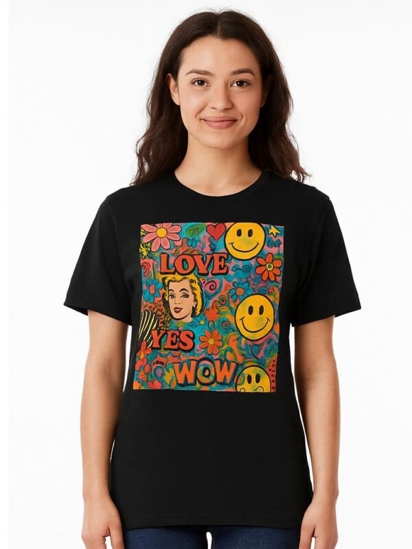 This black tee radiates retro joy—featuring smiley faces, flowers, and bold words like “LOVE,” “YES,” and “WOW” against a swirling psychedelic backdrop.
