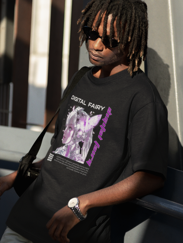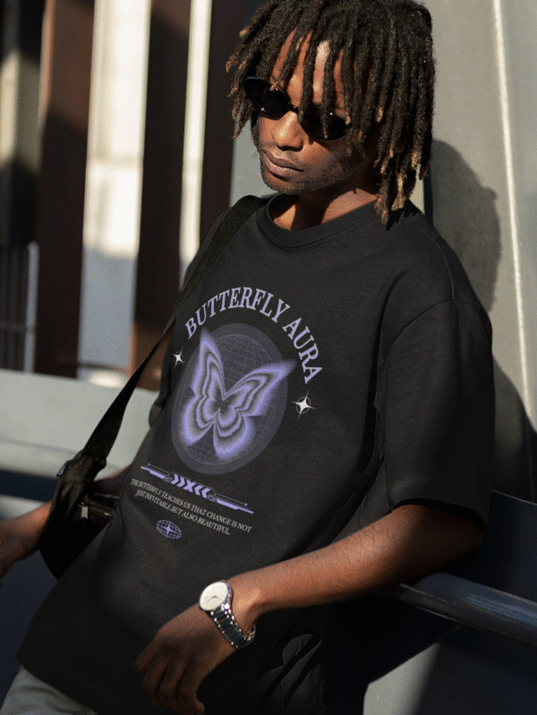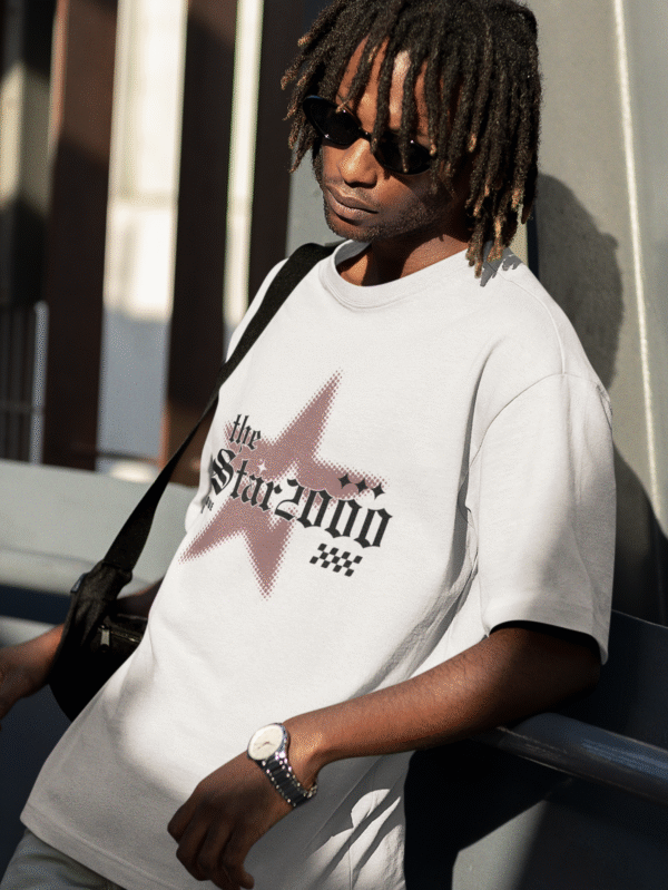 Stand out with this striking white "Hole in the Earthcore" t-shirt, styled with a black jacket, sunglasses, and a confident urban pose.